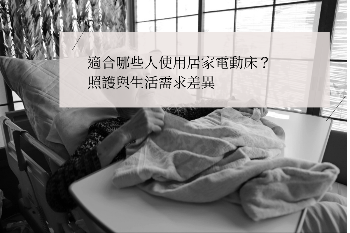 電動床: 主要功能是「姿勢調整」,透過升降來輔助使用者起身、用餐、改變重心,適合行動不便但仍有部分活動能力的使用者。